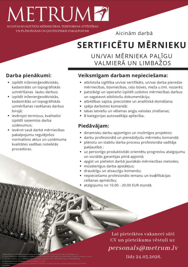 SIA „METRUM”, aicina darbā uzmērīšanas darbu veikšanai